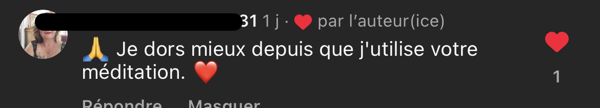 "Je viens d'écouter votre méditation... Je médite quasiment chaque jour (en utilisant une application sur mon téléphone). Les méditations me font généralement du bien psychiquement, mais la vôtre a également irradié mon corps physique d'un bien-être incroyable, comme après l'amour ou un long massage ! C'est la première fois que je ressens cela, et je voulais vous le faire savoir et vous exprimer toute ma gratitude."
