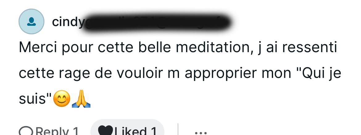 "Merci infiniment pour cette puissante méditation. Un pur bonheur et un sentiment de profonde plénitude..."