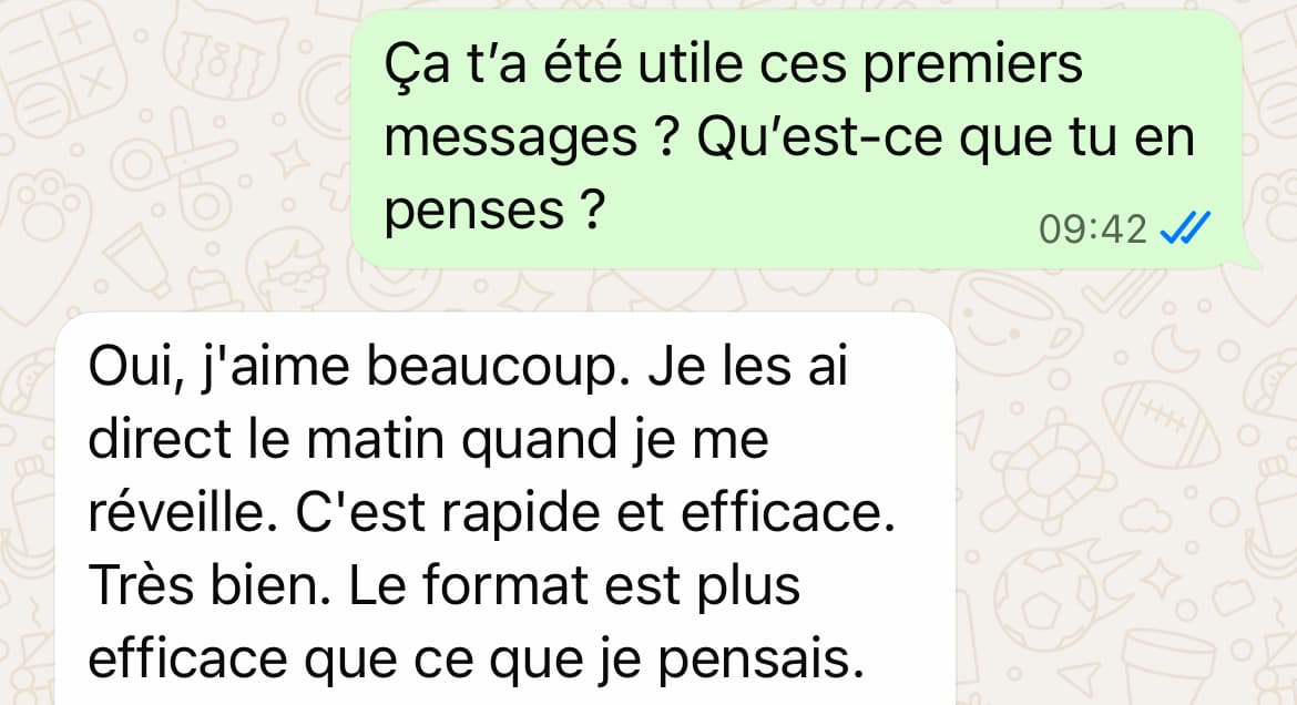 → Chacun de nos messages sera conçu pour t'apporter un maximum de valeur en un minimum de temps. Il y aura chaque jour quelque chose de concret à en tirer.